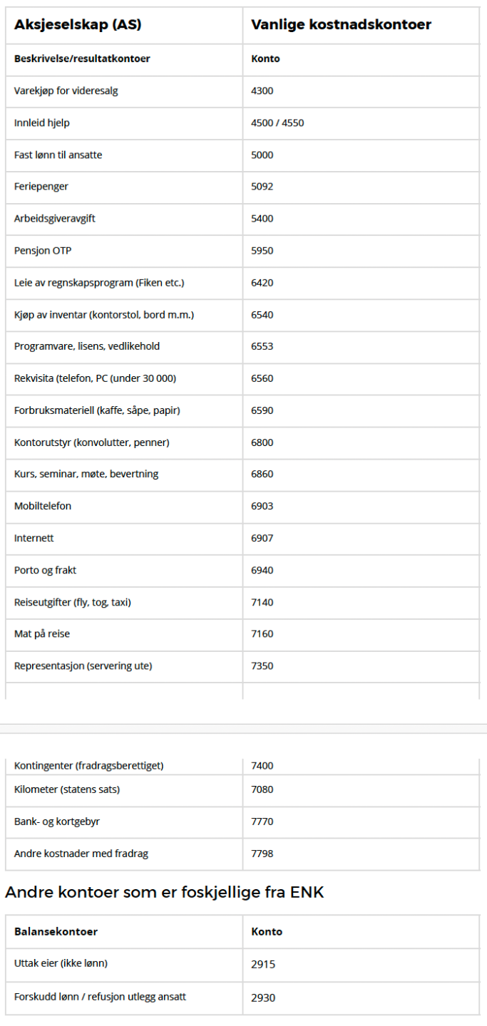 Her er de vanligste kostandskontoer for et AS