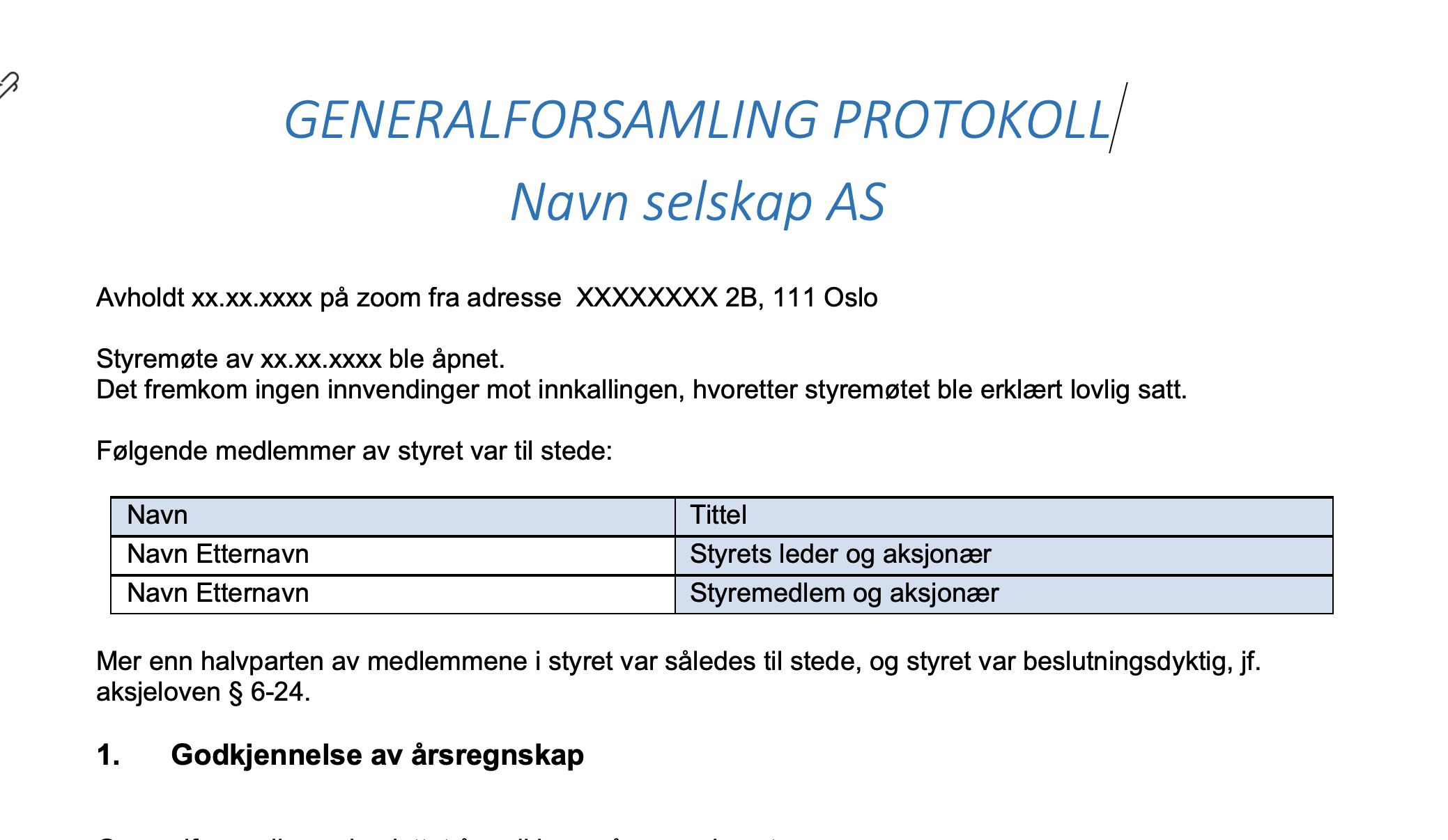 Her kan du laste ned en Wordmal for å lage generalforsamlingsprotokoll i et AS.
