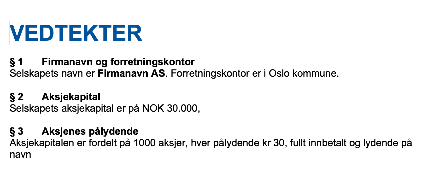Her kan du laste ned en Wordmal for å lage eller endre vedtekter i et AS.