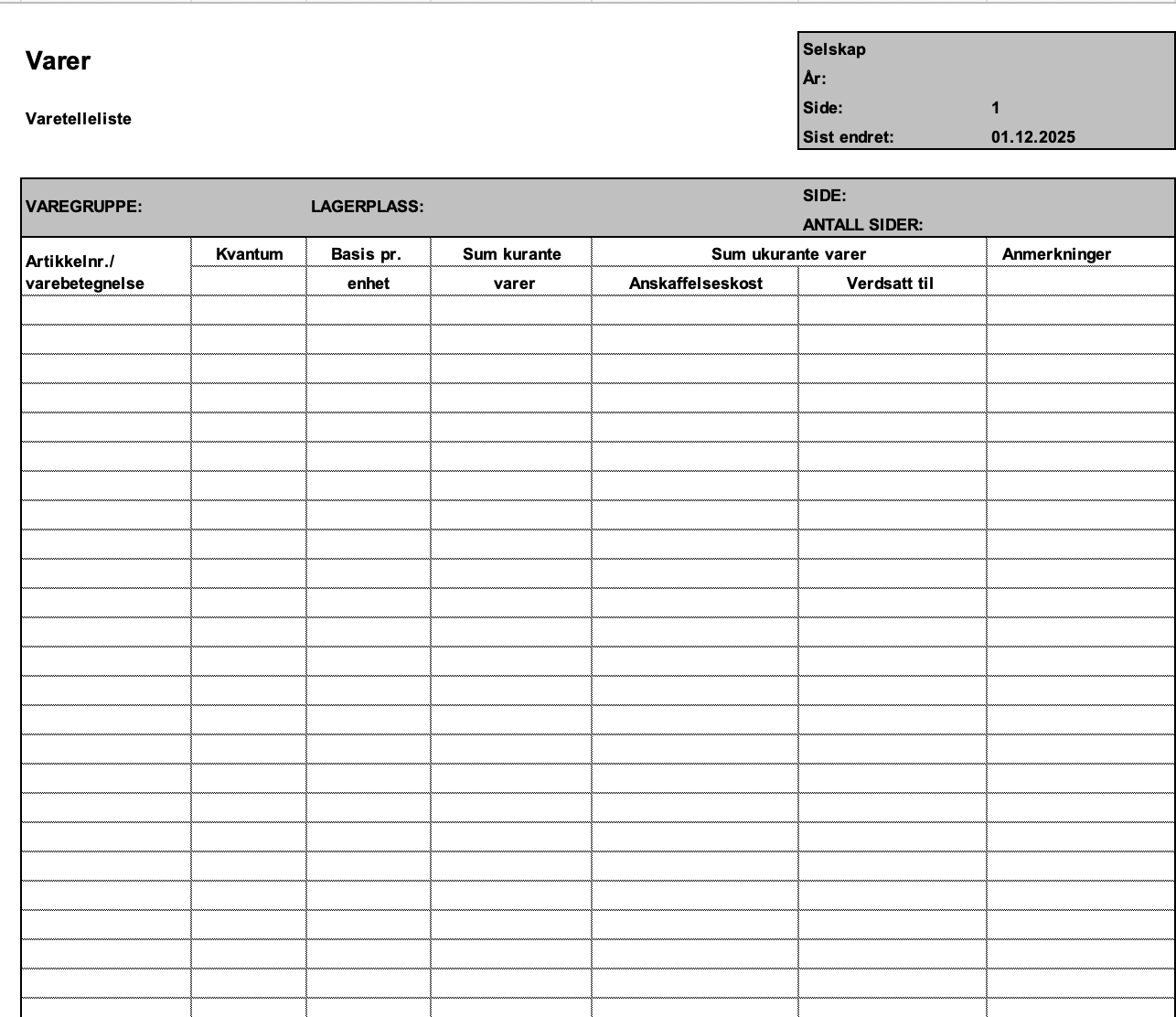 Her kan du laste ned Excel mal for varelager. Brukes som velegg for bokføring i regnskapet